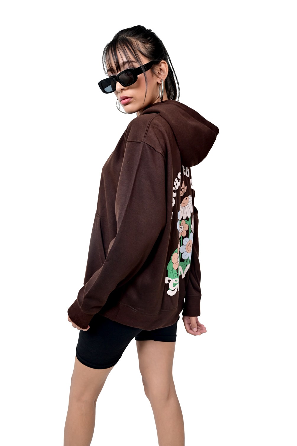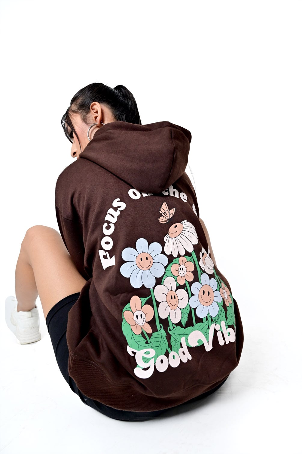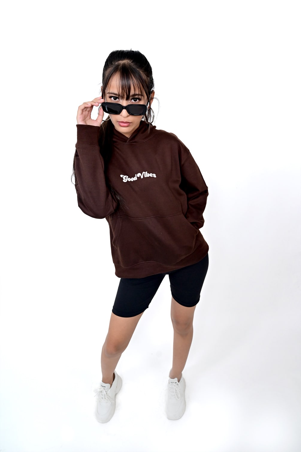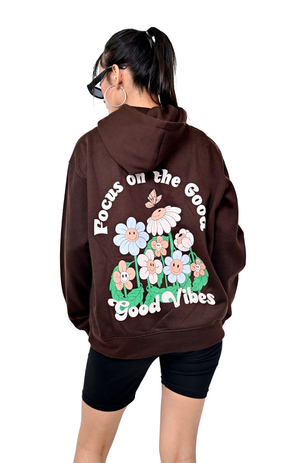 Embrace ultimate comfort and style with our Brown "Good Vibes" Oversized Hoodie. Perfect for any casual occasion, this hoodie is designed to make a statement with its eye-catching prints on the front and back.